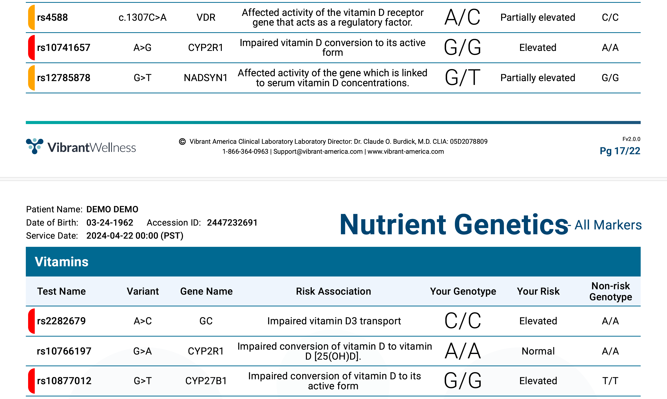 Lastly, the Nutrient Genetics test offers testing for genetic variants for several forms of vitamin D, including 1,25-Dihydroxyvitamin D. That way, if results are abnormal (heterozygous variant or homozygous variant) that would enable healthcare providers and patients to have a clinical suspicion for lifetime risk of 1,25-Dihydroxyvitamin D deficiency