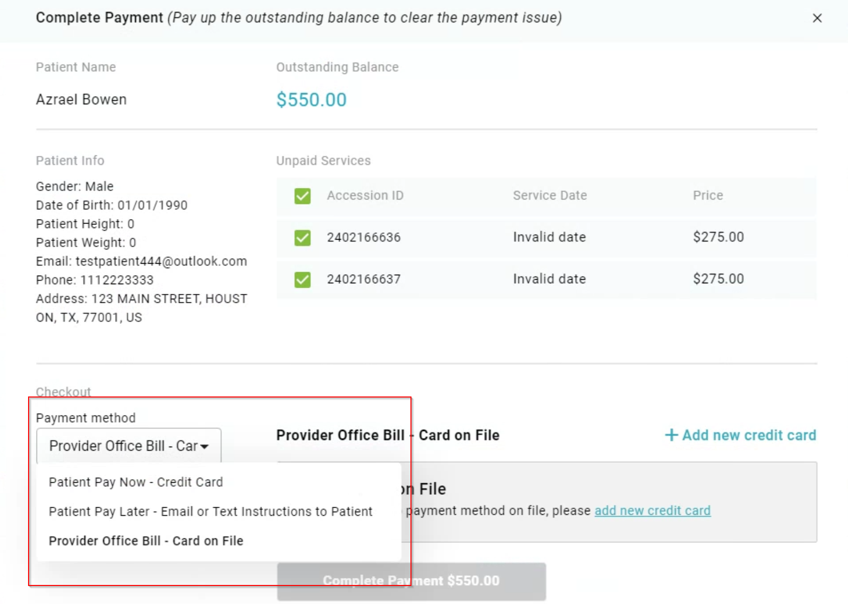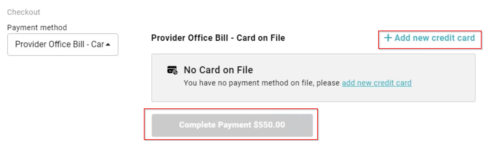 - Provider Office Bill - Card on File : You have the option to charge the provider's cc saved on file and complete the payment. You can also add a new card and run the payment.