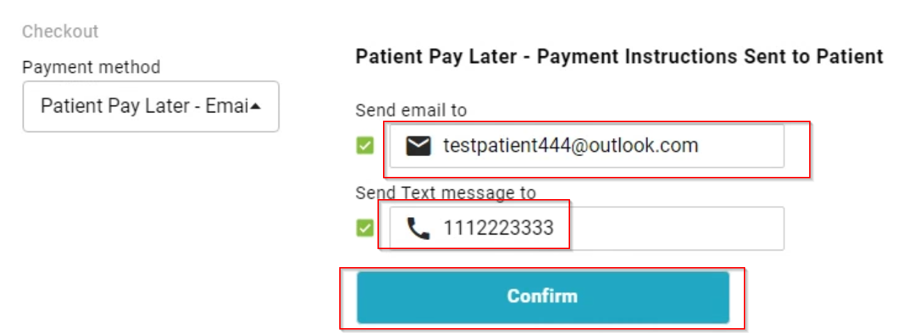 - Patient Pay Later - Email or Text instructions to Patient : You have the option to text and/or email a payment link to the patient.