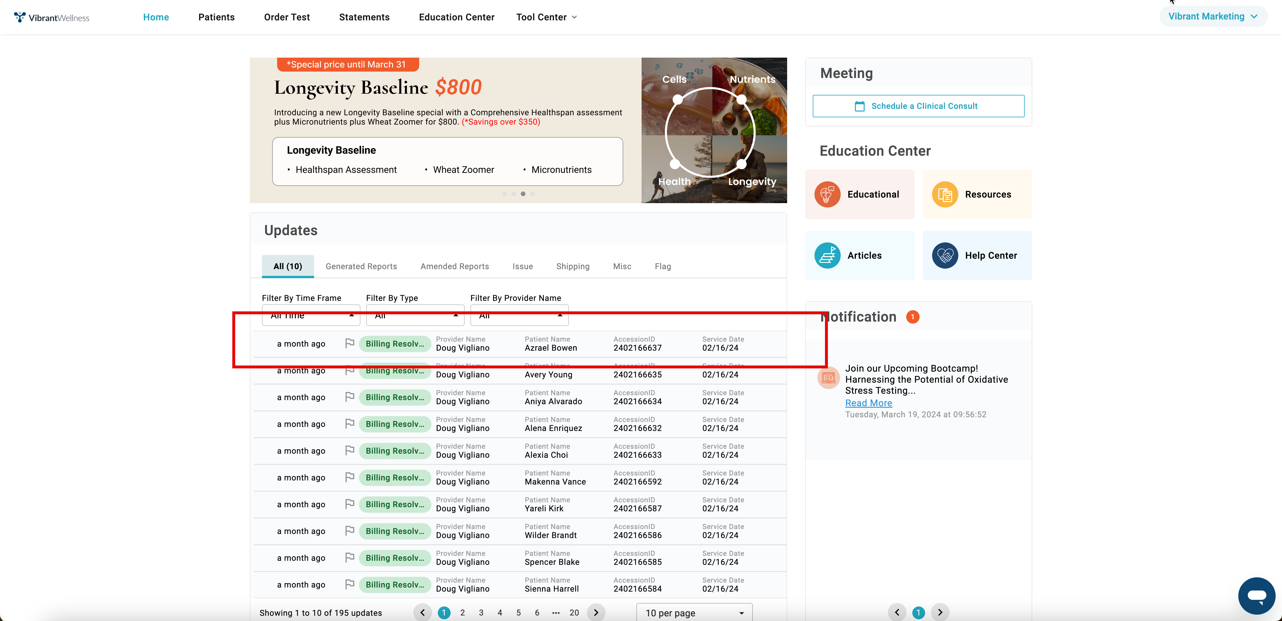1. Selecting the name of a patient in an update from the Updates Section will take you directly to the patient profile