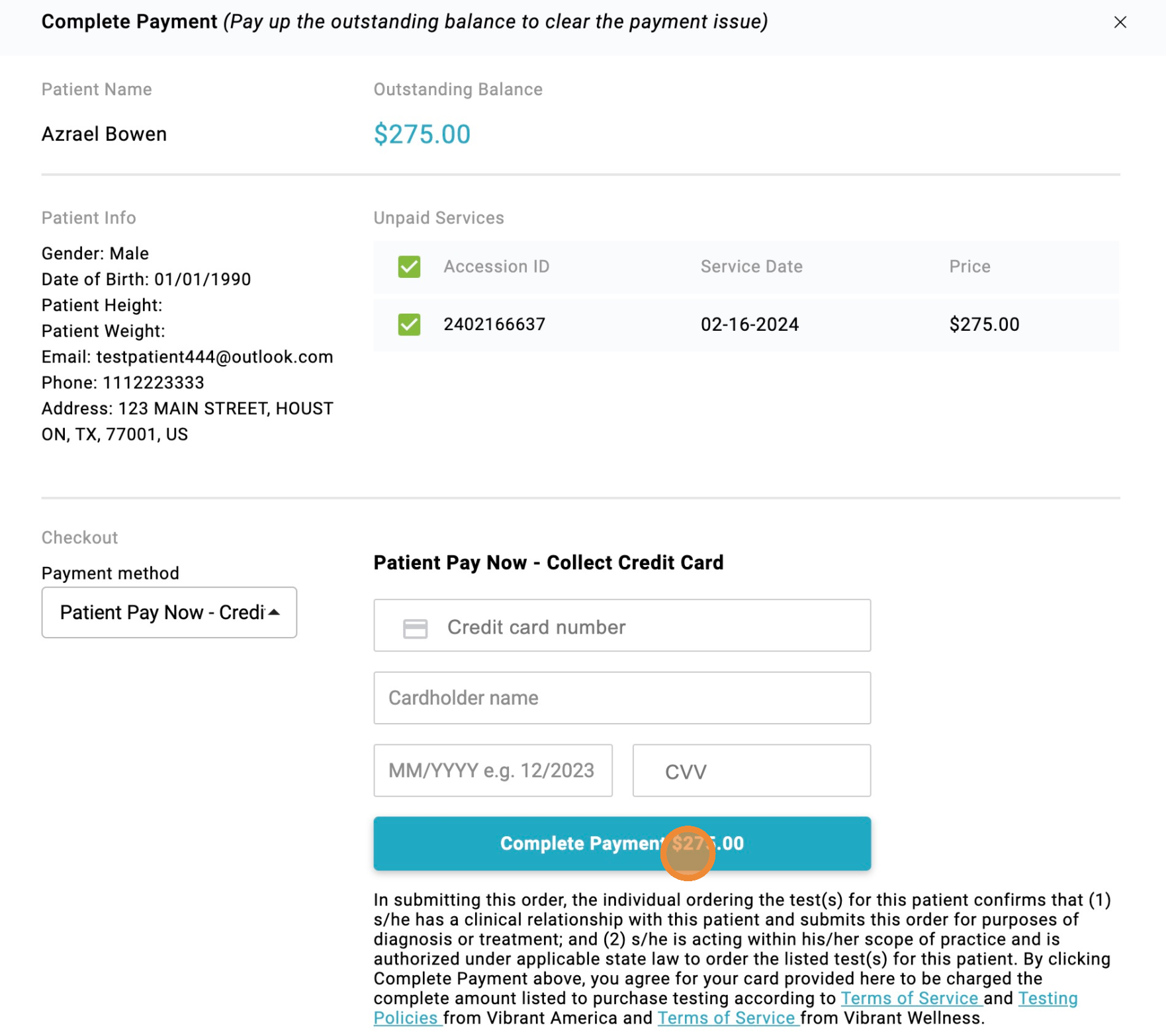 6. Click "Complete Payment $275.00" to complete payment and send the patient an email receipt