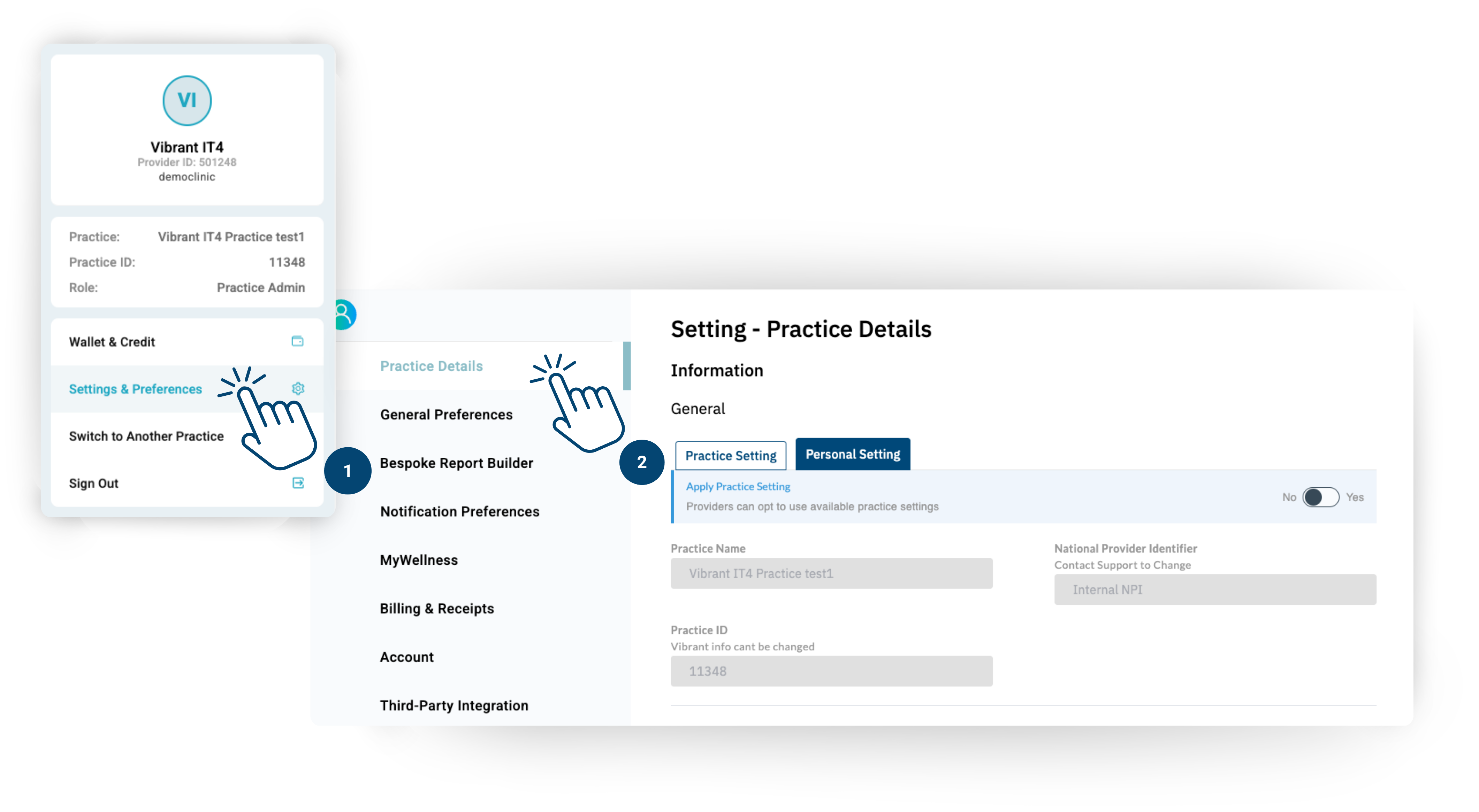 Your Practice Name and NPI number cannot be changed after account setup. If you need to change your NPI number, contact support to change these settings. Your Practice ID is for our identification purposes and cannot be changed.