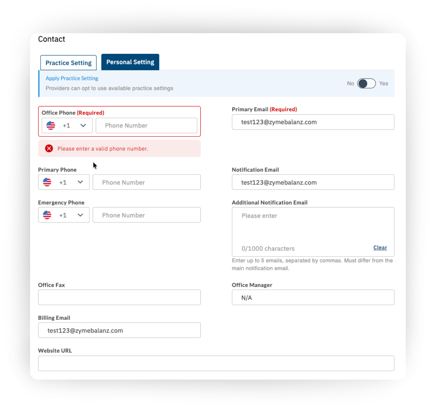 Primary Email*: On a Practice Level, many practices enter the generic email address for their practice, such as info@startupsuzi.com