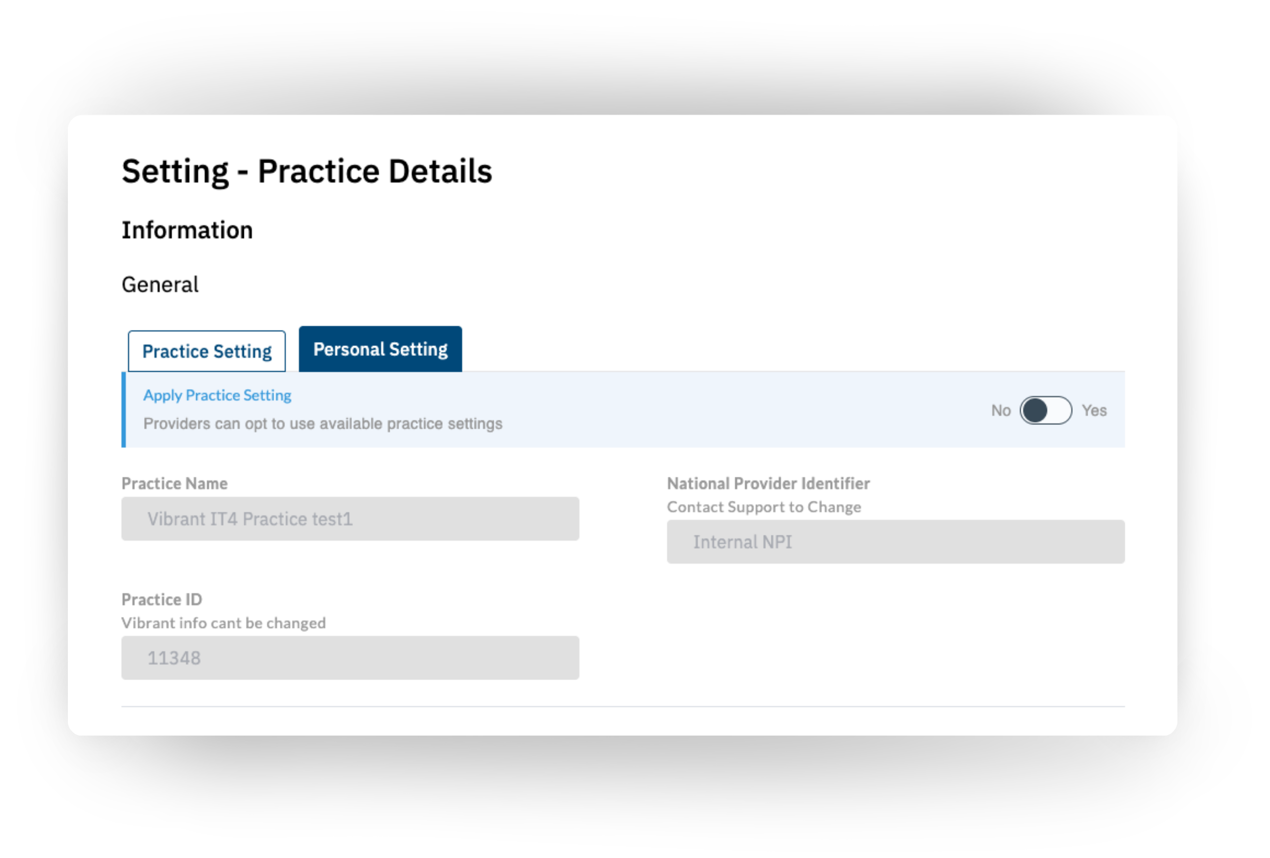 Practices with only one provider will not be able to see the distinction between Personal and Practice Settings. The settings shown to single-provider practices are Practice Settings. While the single provider is the Practice Admin by default, Personal Settings will not be viewable until another provider is added to the practice. Any settings updated before the addition of more providers will be Practice Settings with the 'Apply to Every Provider' toggle on.