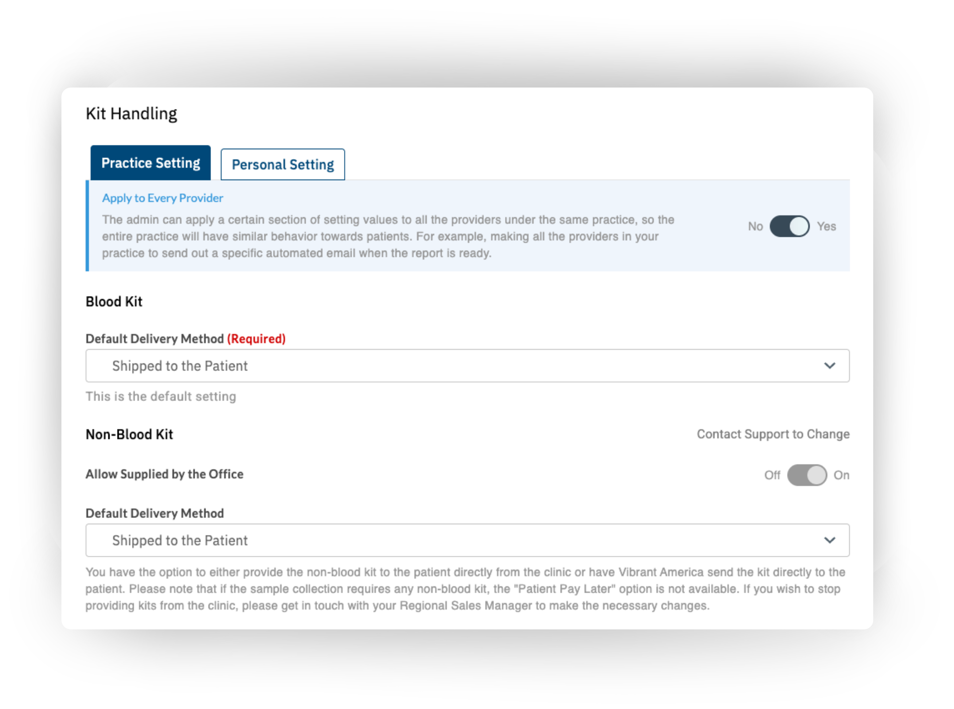 On both a practice and personal level, a default delivery method may be selected for Blood Kits and Non-Blood Kits. You may also choose whether or not to allow the "supplied by the Office" delivery method to be selected. If you do not plan to keep test kits on hand, it is recommended to keep this toggle in the off position to prevent mistakes.