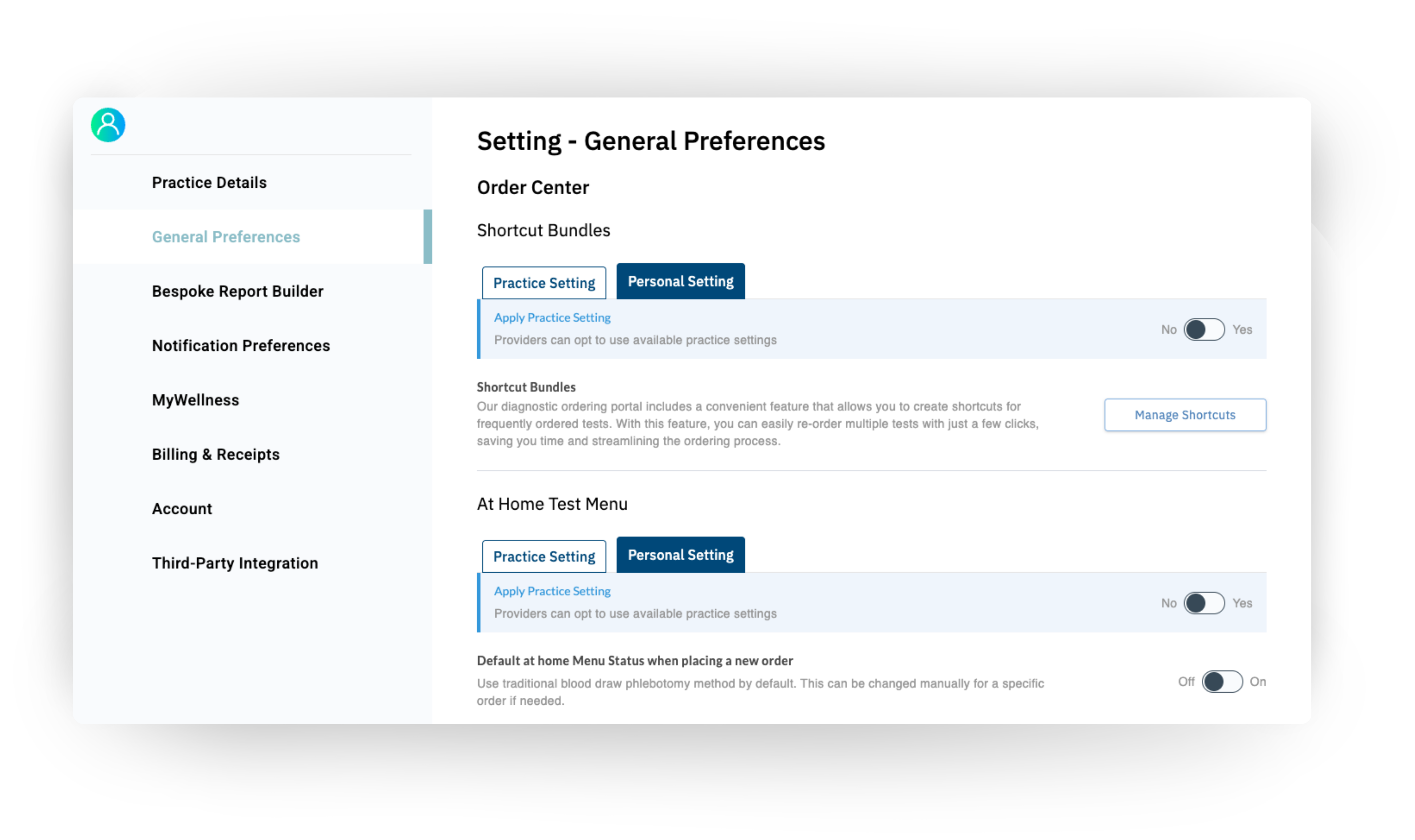 On both a provider and practice level, manage general preferences related to favorites, the test menu, drafts, default delivery methods, and Patient Navigator Settings.