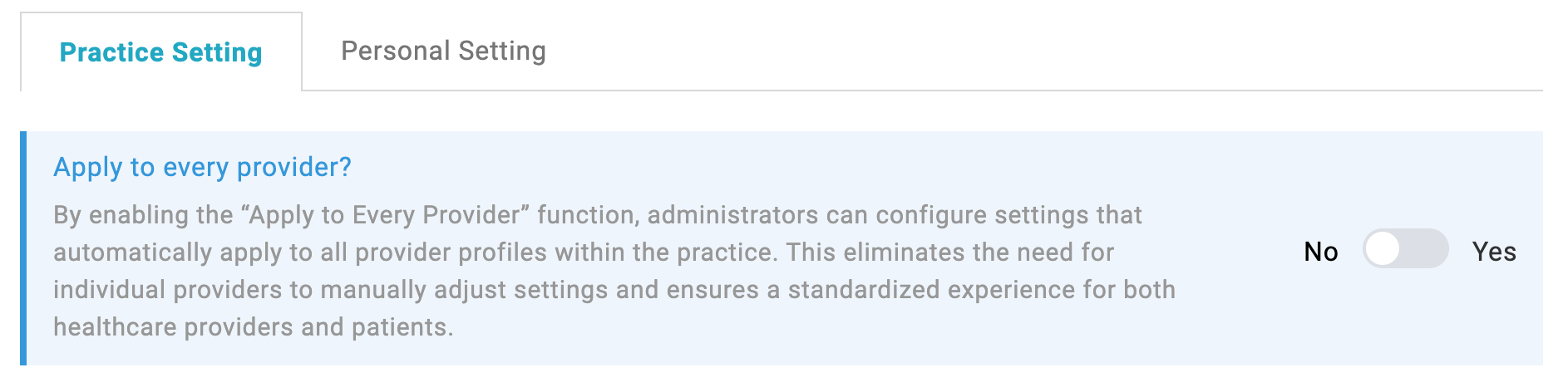 1. Practice Admins: Can take actions on behalf of all providers, manage providers, and set practice level default settings/ Preferences. The "apply to every provider toggle" will set a practice wide default and override and personal level settings. If toggle is off, Practice Admins may still specify practice settings that providers may opt-in to on a personal level if Practice Admins still want to give Providers a choice.