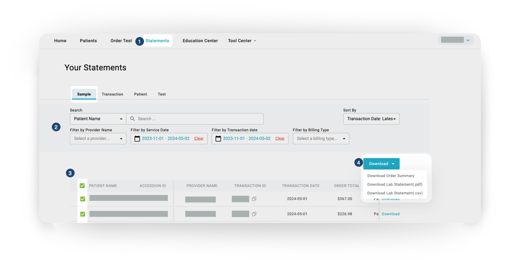 To download patient statements by Sample:
