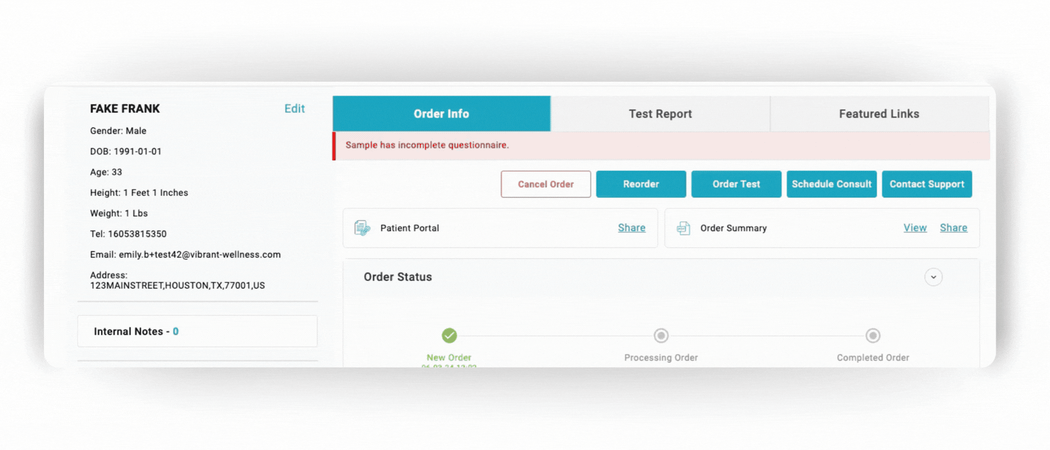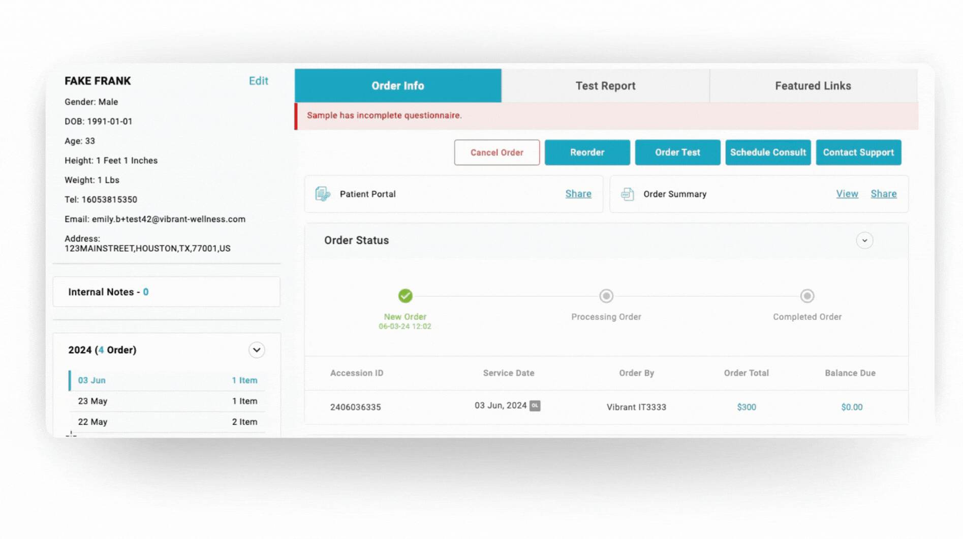 If an order is scheduled for a later date, the seven-day delay for the issue flag will not start until the order summary is sent to the patient on the scheduled date. The remaining balance can be viewed prior to the scheduled date from the Patient Lab Profile.
