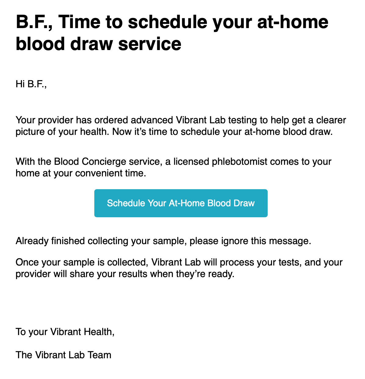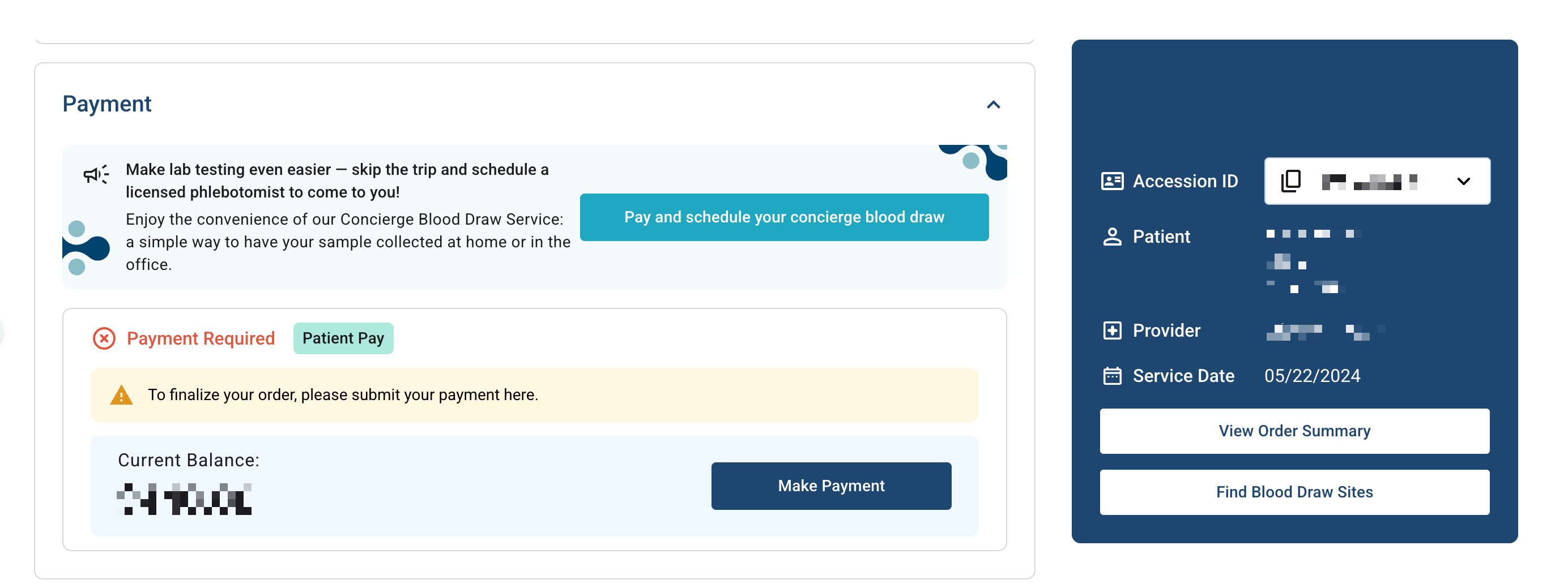If Patient Pay Later is chosen as the payment method, the patient must make payment before their order can be shipped. When an order that requires a blood draw is placed, the patient will receive the email below after they have received their kit regardless of whether or not the provider added the blood concierge service at the time they placed the order. If the blood concierge fee was not added by the provider, the patient can choose to add it and pay for it separately.