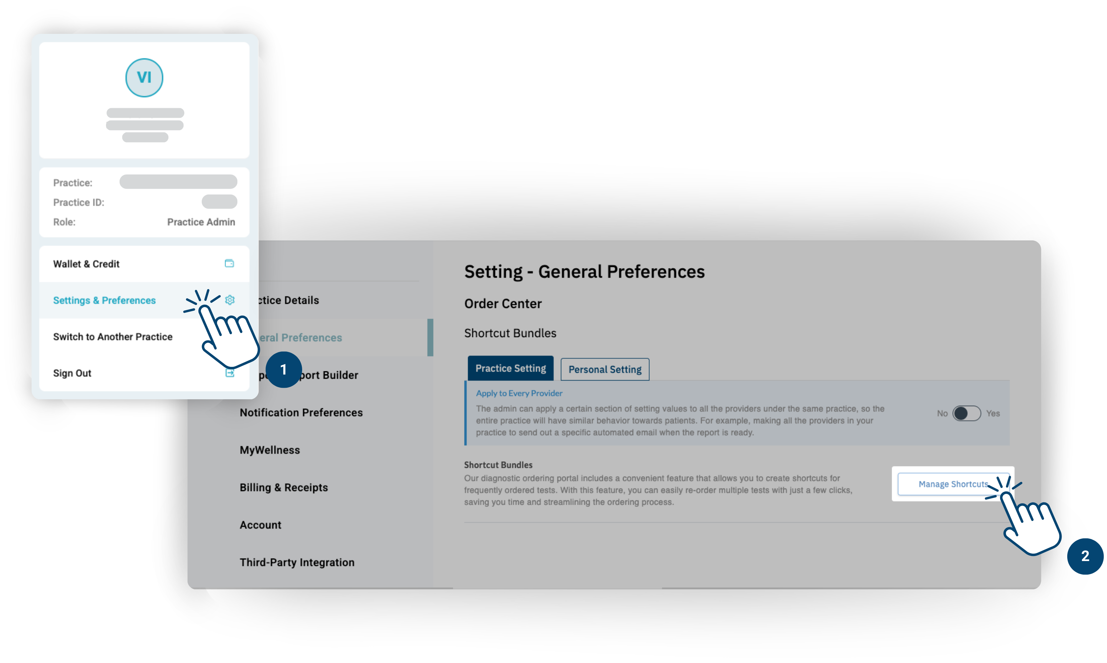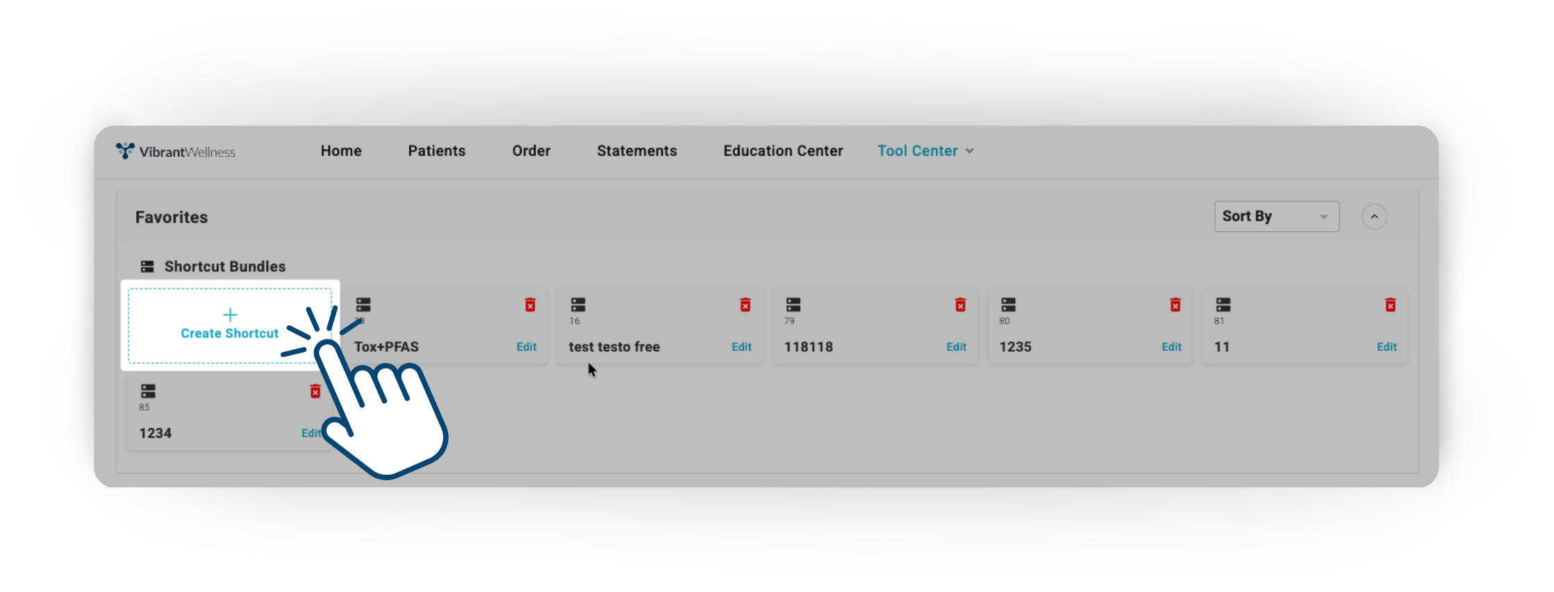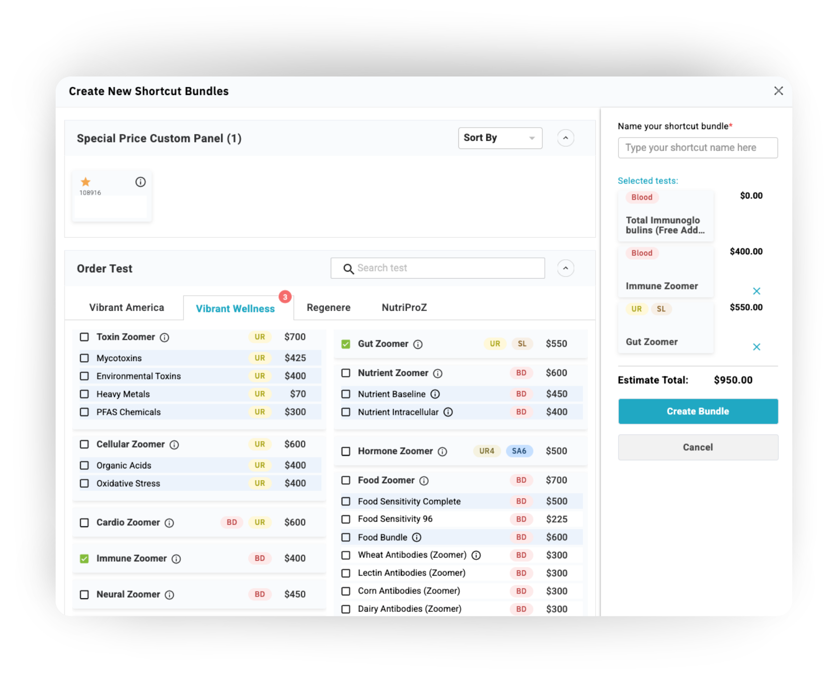 Shortcut Bundles allow providers to save favorite groups of tests that they frequently order together for a more efficient experience. These Shortcut Bundles can be viewed when placing an order for a patient. Selecting a shortcut bundle automatically adds the tests included in the bundle to the cart. These can be managed on an individual or practice level.
