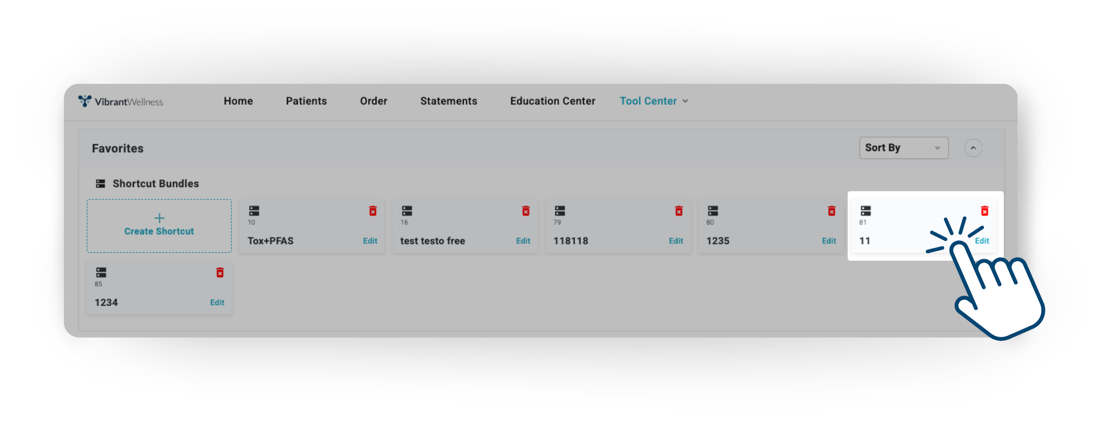 Existing Shortcut Bundles can be edited by selecting the "edit" button on the Shortcut Bundle card. The trash icon on the card will delete the Shortcut Bundle. You will see these options in the Order Test Tab cards if practice-wide Shortcut Bundles are not applied.