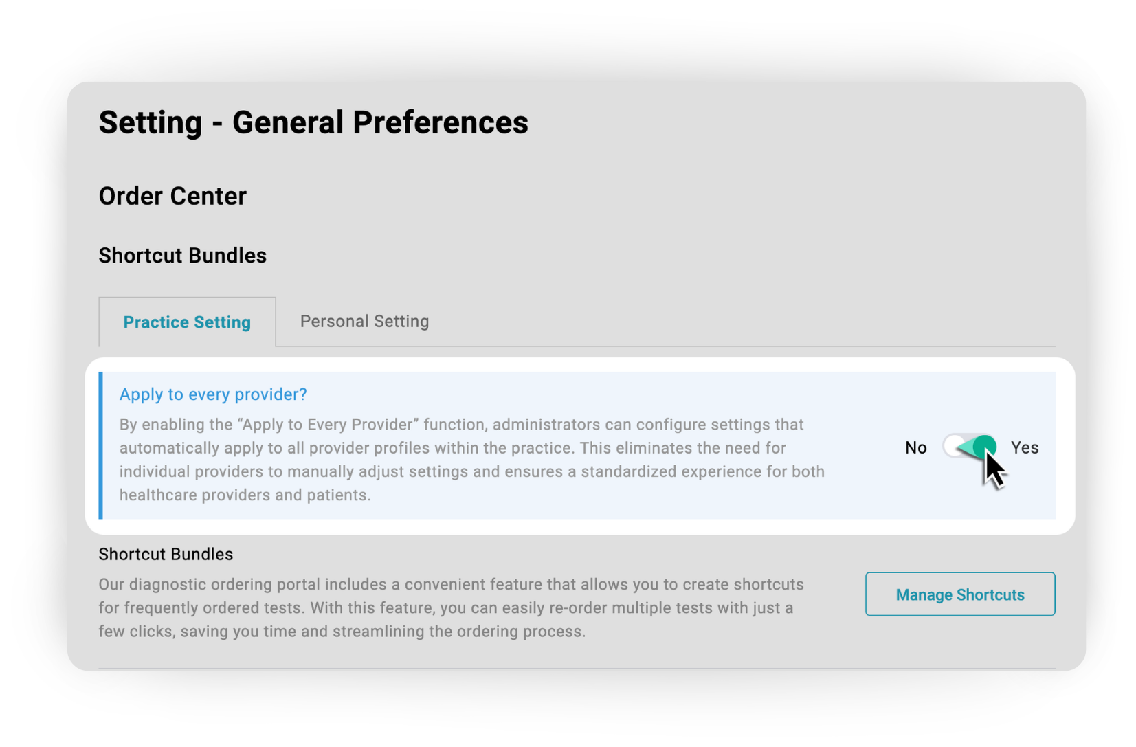 Practice admins can apply and manage Shortcut Bundles for all providers in the practice by using the Apply To Every Provider toggle.