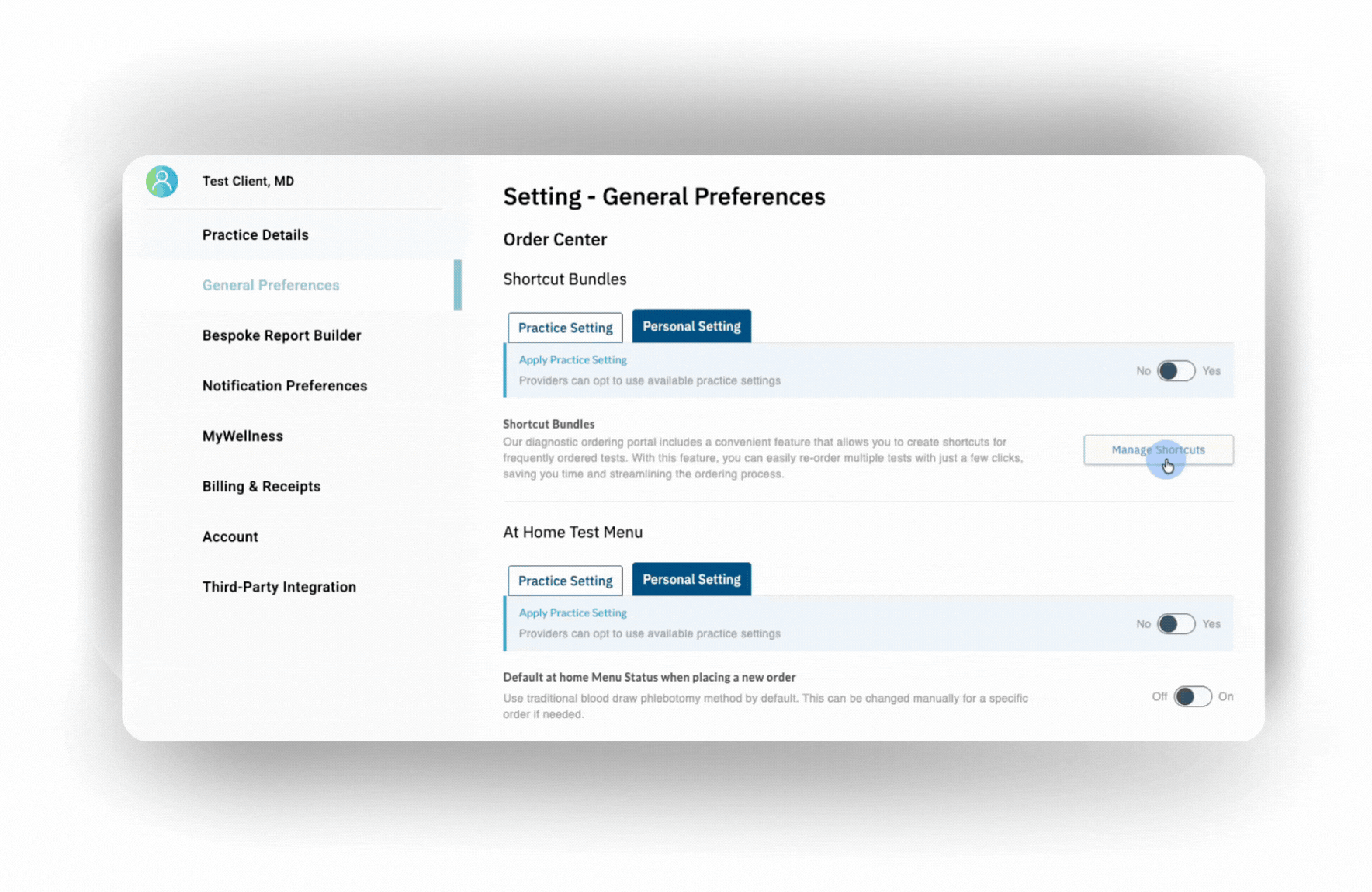 Shortcut Bundles can be managed in General Preferences or they can be managed from the Order Test Tab.