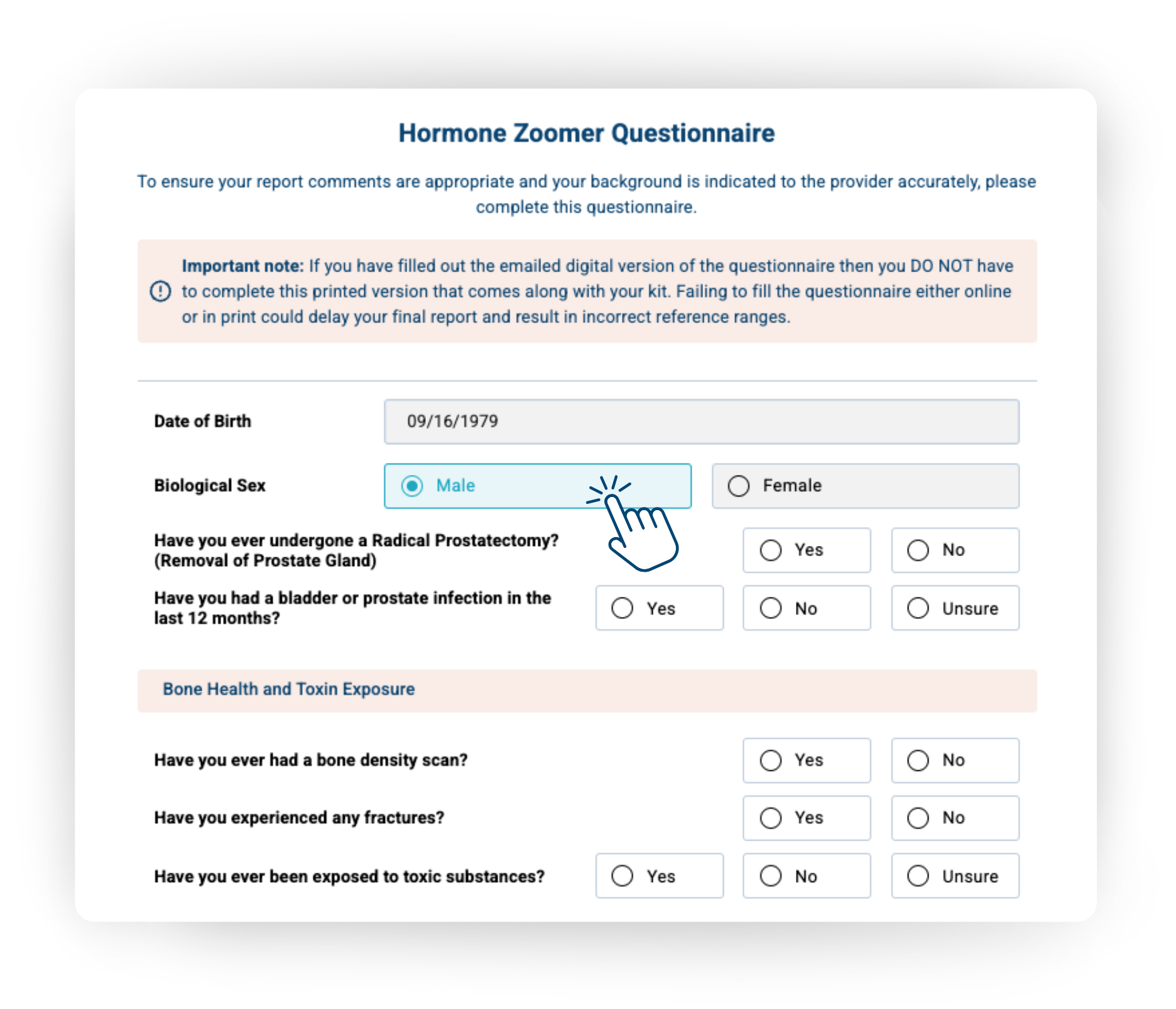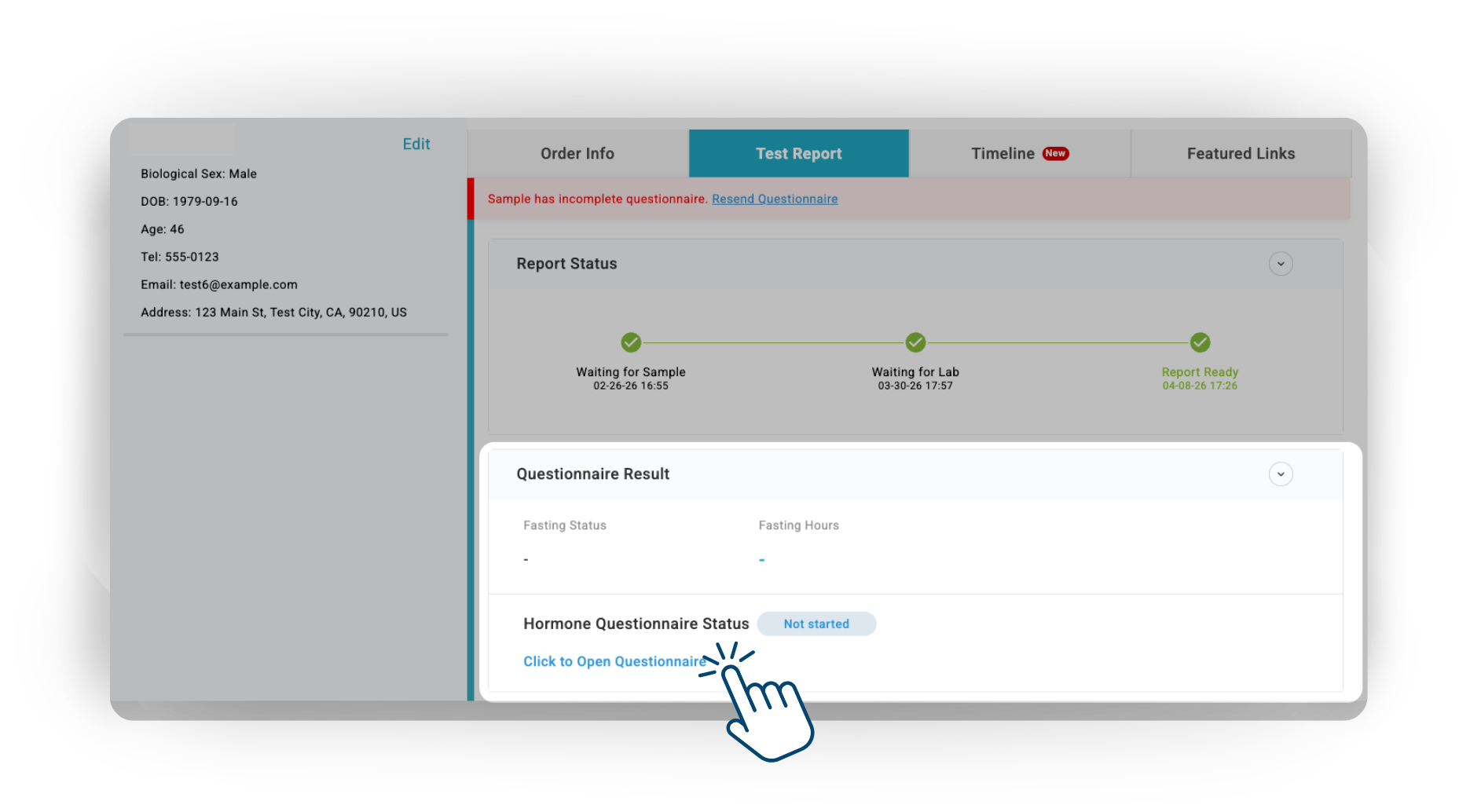 If a patient's order requires a questionnaire, they will automatically be emailed an interactive online form that patients will have to fill out. The results from the questionnaire are auto-filled into the Provider Portal.
