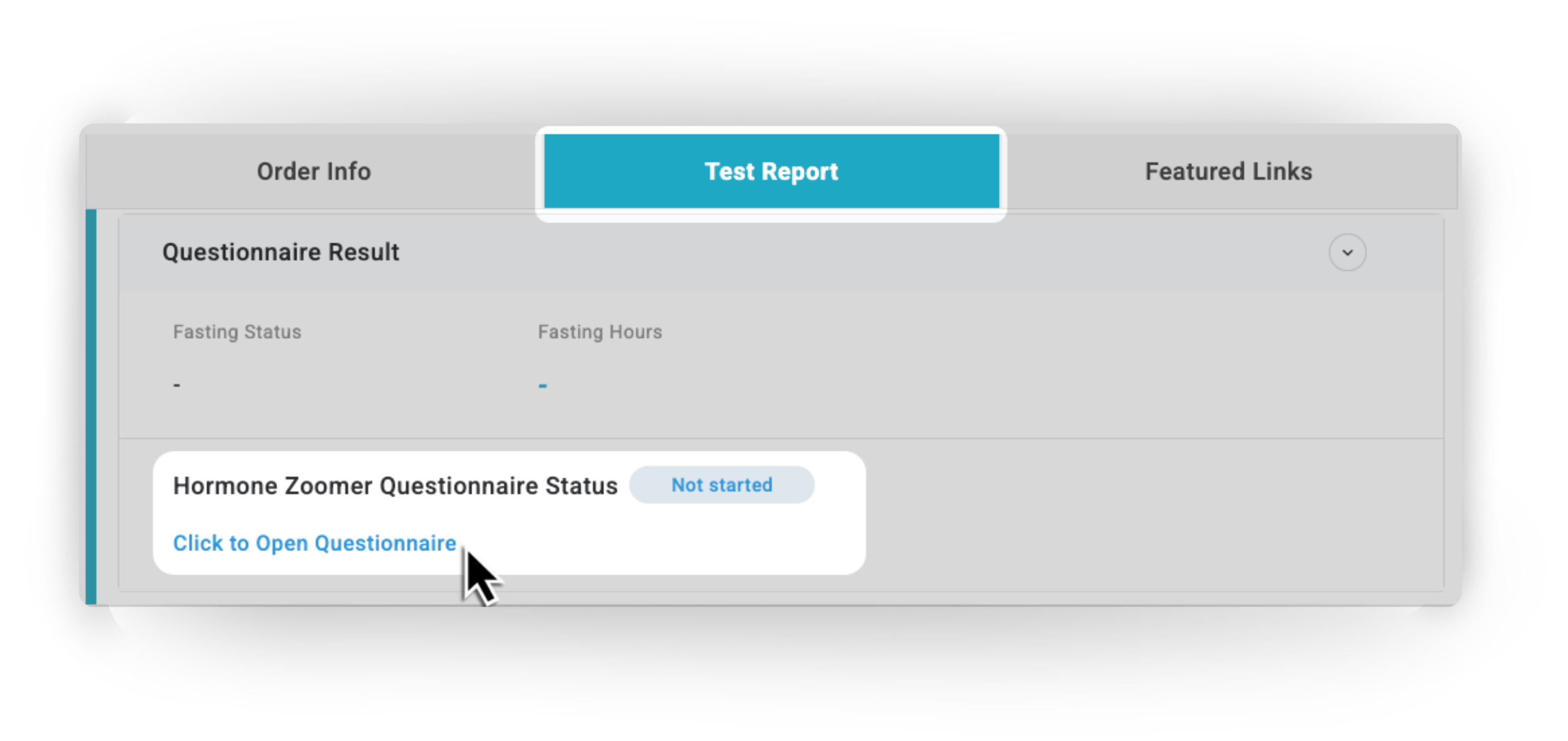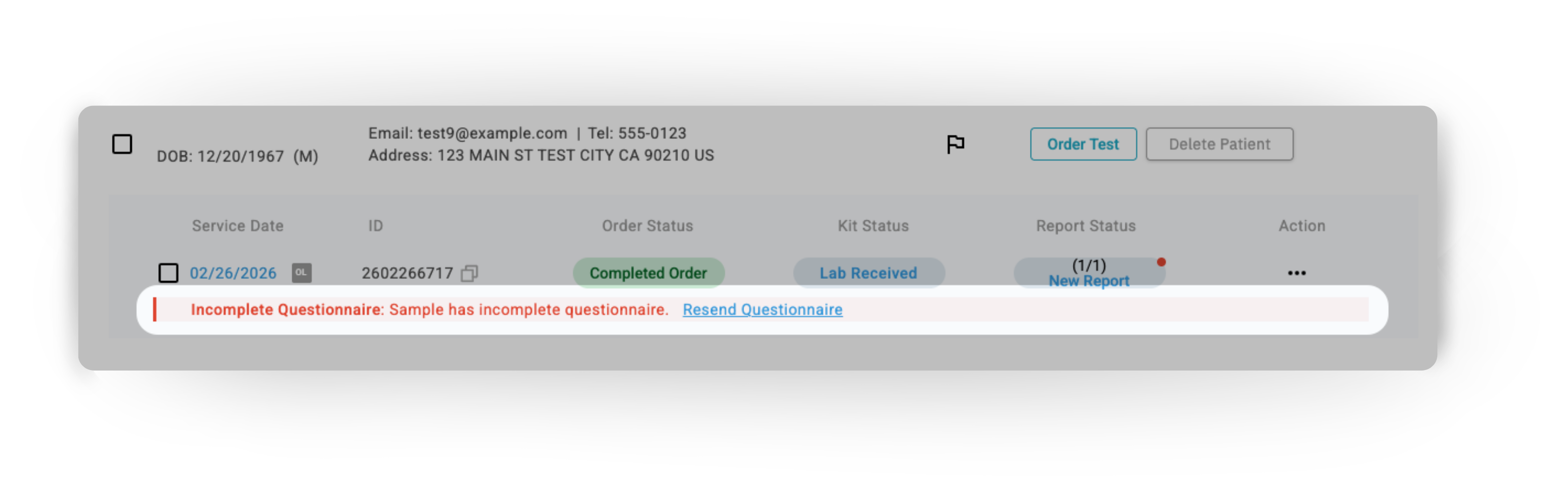 Open the Patient Profile by selecting the patient's name anywhere in the portal. Then, scroll to the Questionnaire section of the Test Report tab