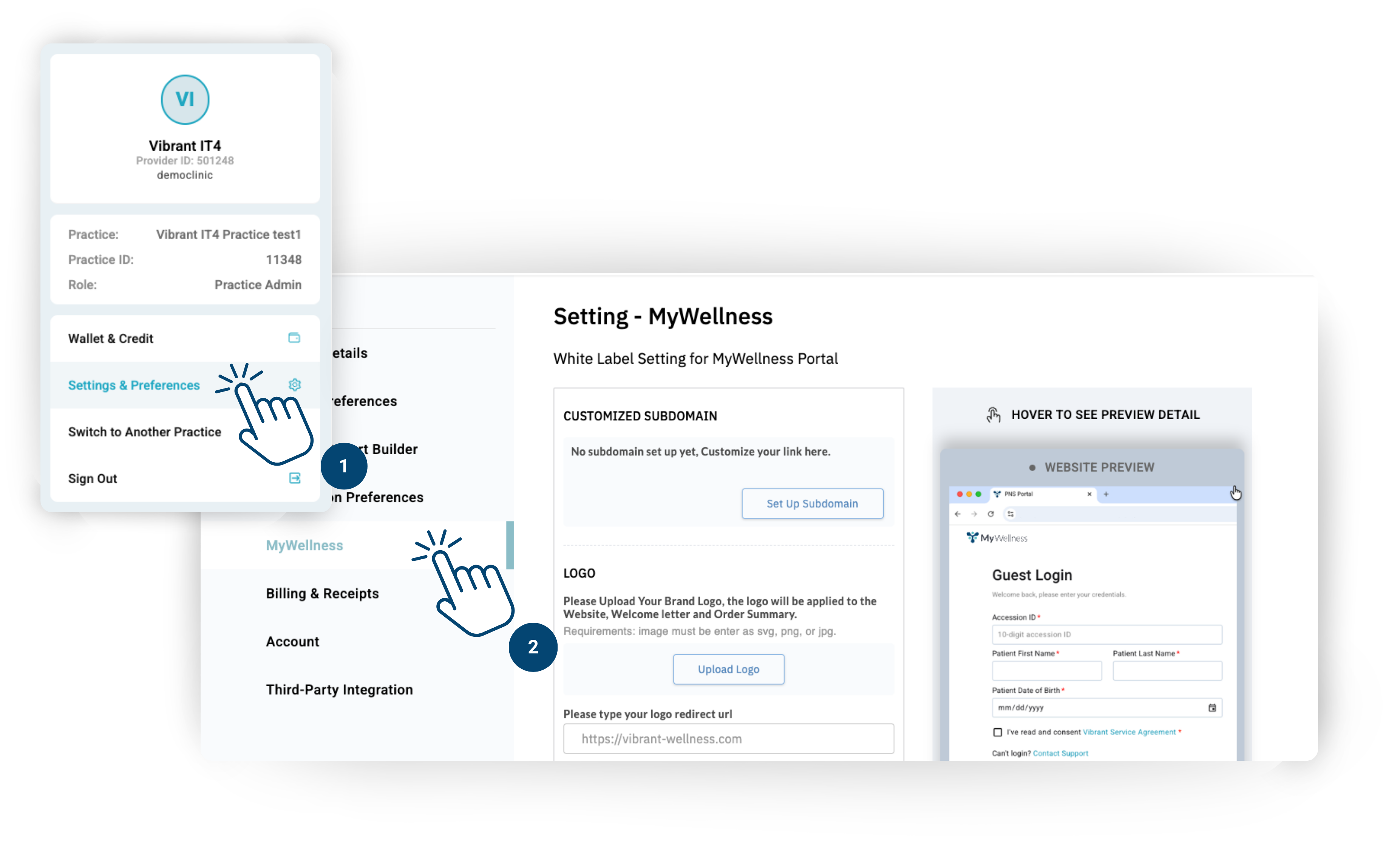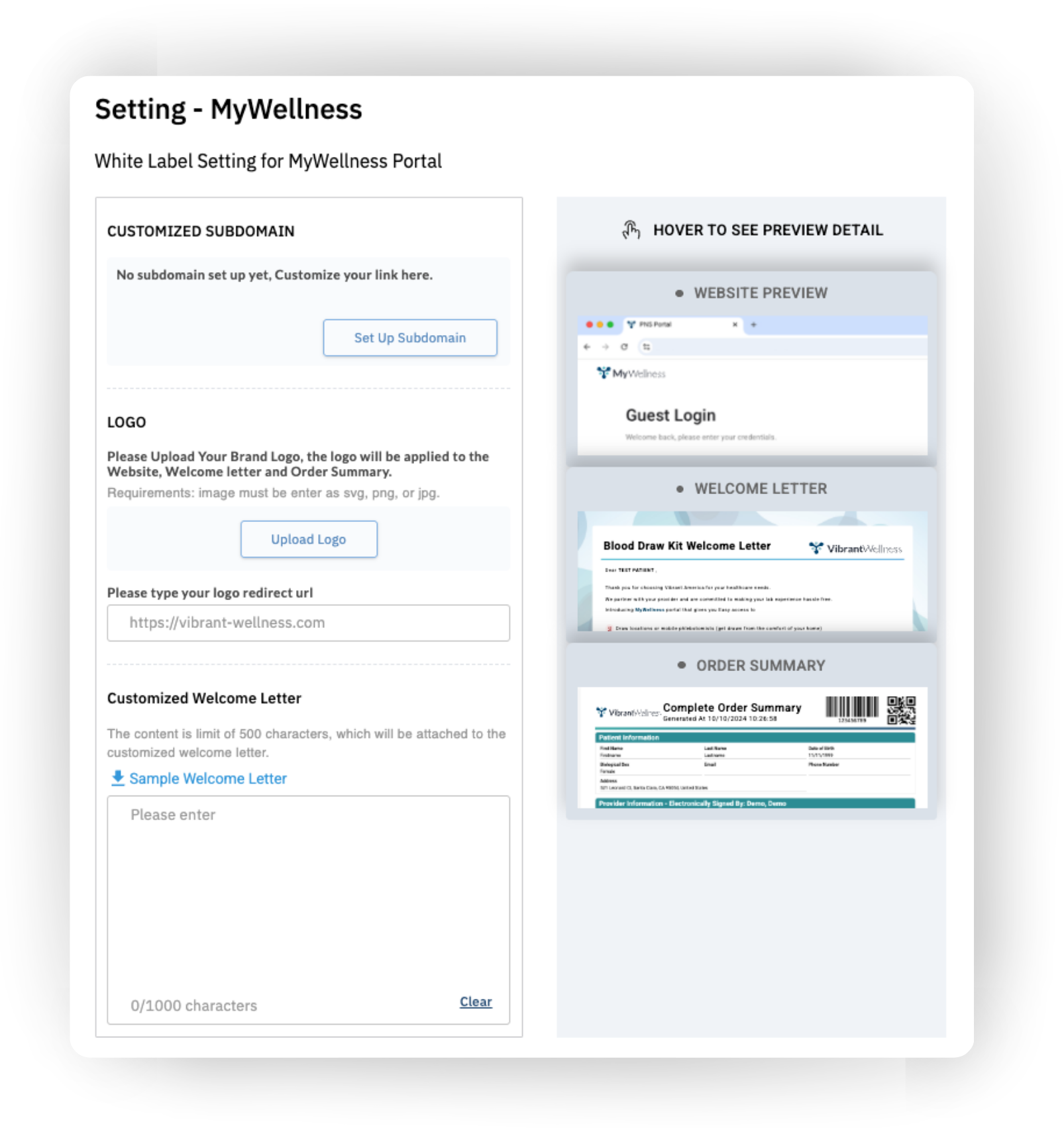 - Logo Upload: Upload a practice logo to display in the My Wellness portal, the patient welcome letter, and order summaries.