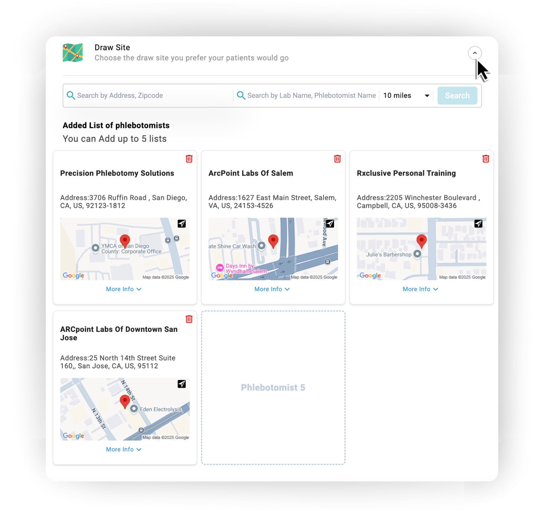 ⚠️ If no preferred draw locations are configured, patients will see the standard Vibrant blood draw map with all available partner sites. In-office options will only display if the in-office draw toggle is enabled.
