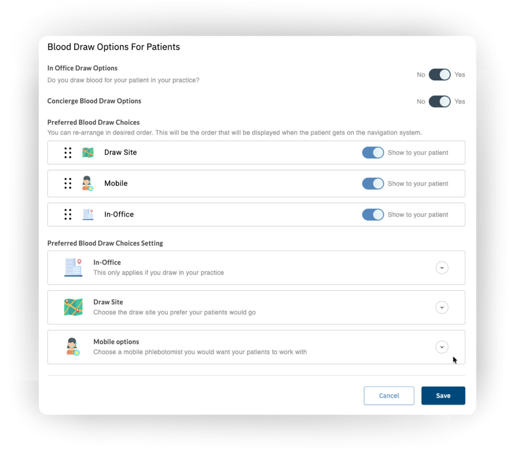 In-Office Draw Options Toggle: Enable this to display in-office blood draw options to patients within the My Wellness portal. Preferred Draw Locations: Toggle on to activate this feature, then scroll down to add preferred mobile phlebotomists or draw site locations. These will appear to patients in addition to default options.