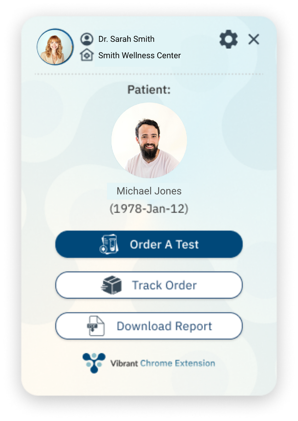 Sync Via API: The extension securely passes additional information including first name, last name, email, address, and gender into the Vibrant Wellness Portal, reducing the need for patient data entry.