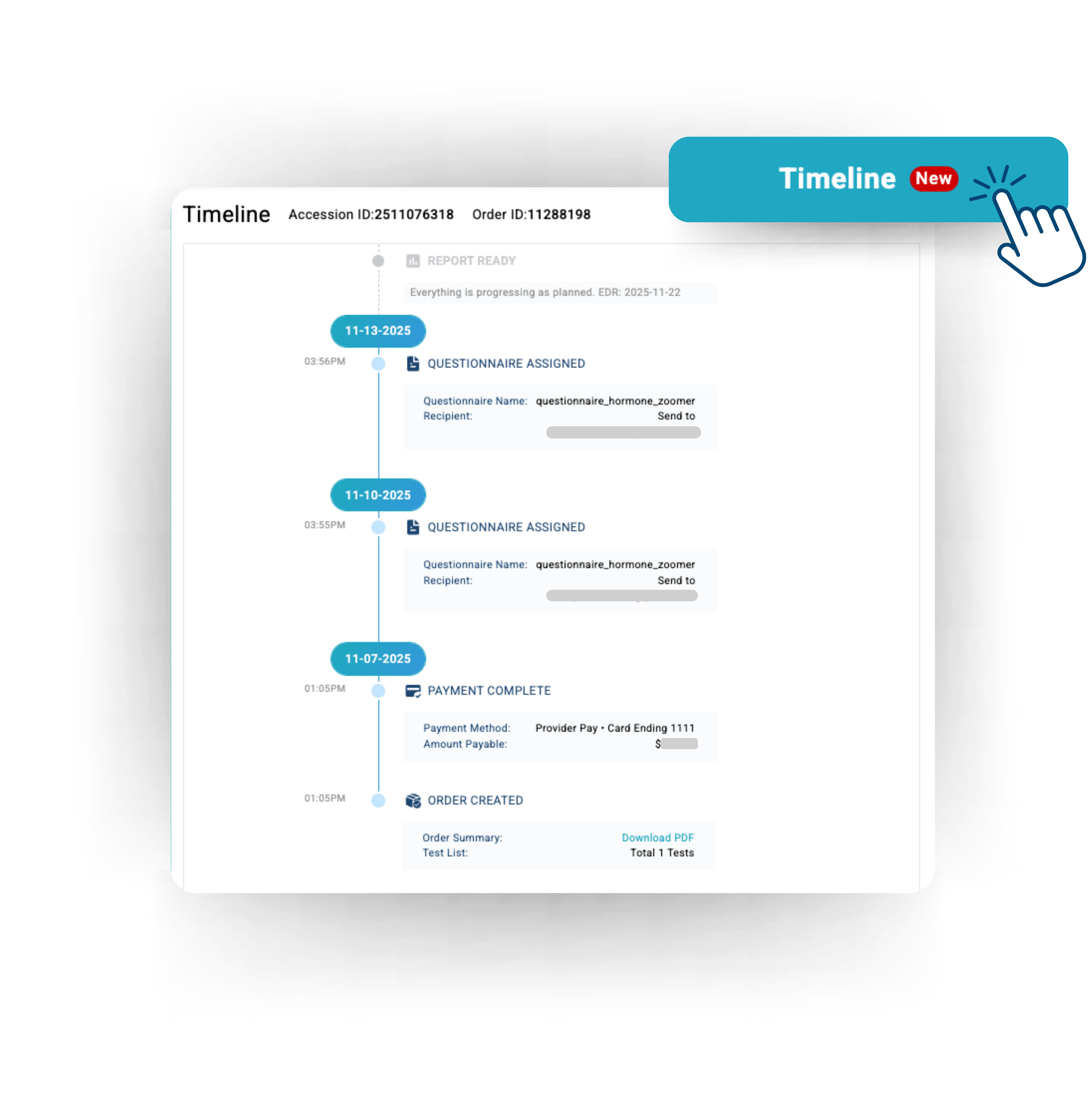 The Sample Timeline provides a single, consolidated view of the full sample lifecycle. It displays all events from order creation through reporting, allowing users to track progress and view details in one location.