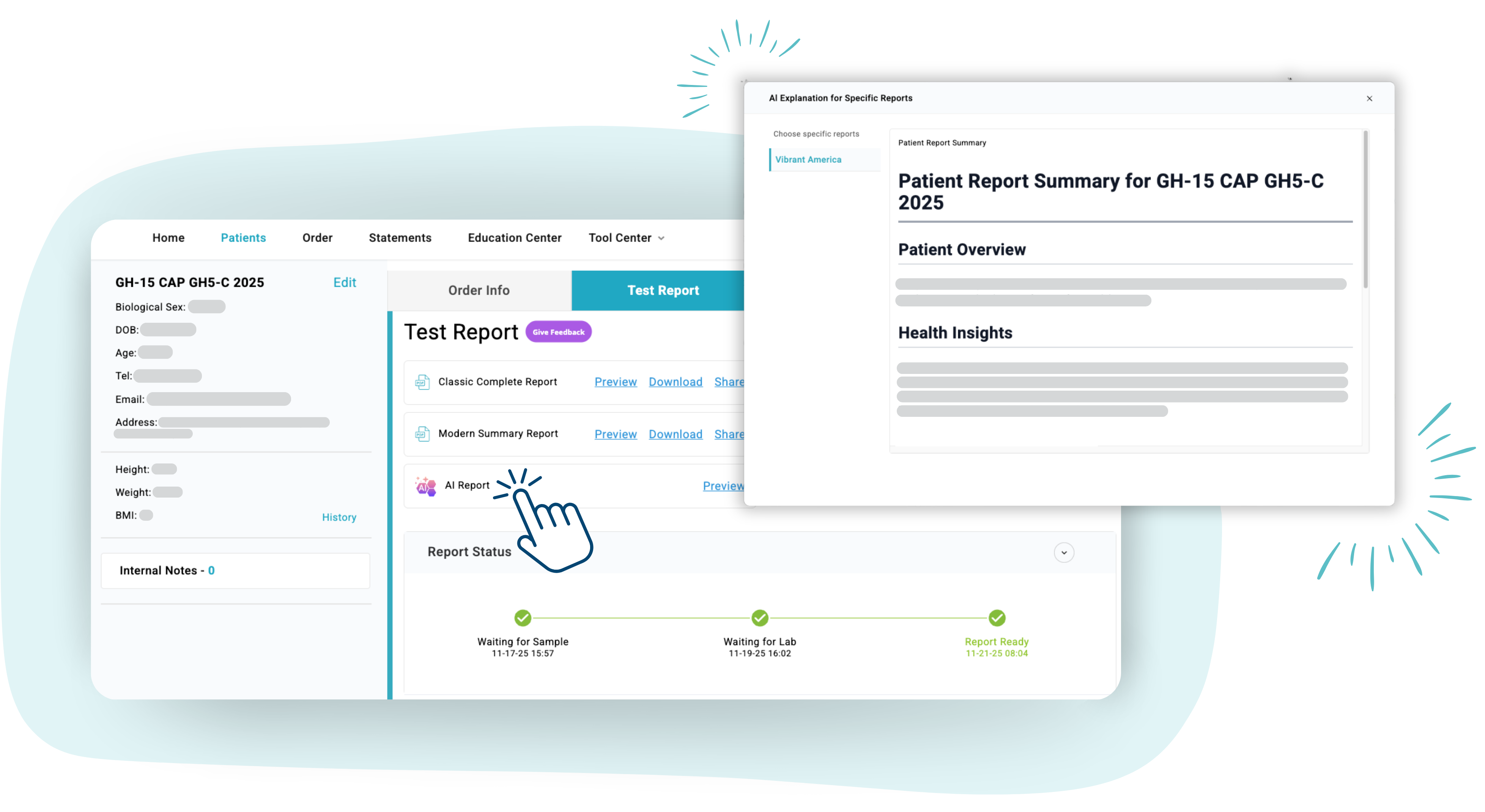 The Vibrant Reporting Suite brings together three reporting tools that help users understand results faster, tailor insights to each patient, and deliver care with confidence. Each tool supports a different aspect of report review and customization, creating a unified experience across Vibrant test panels.