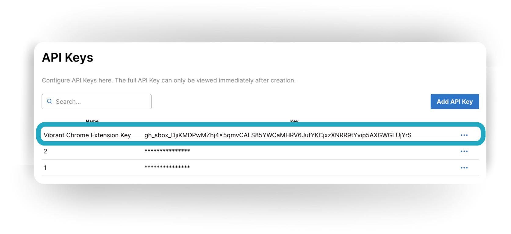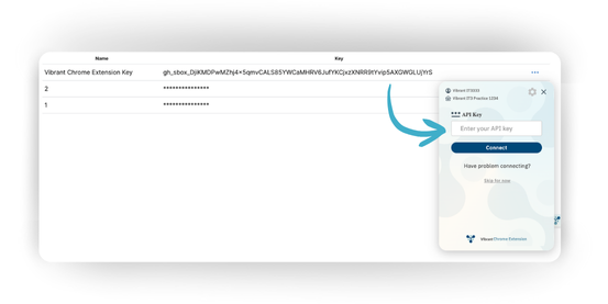 The API Key will now show up with the rest of your API Keys. Have this information on hand when syncing the Vibrant Chrome Extension to Healthie, as it will be required when syncing via API.