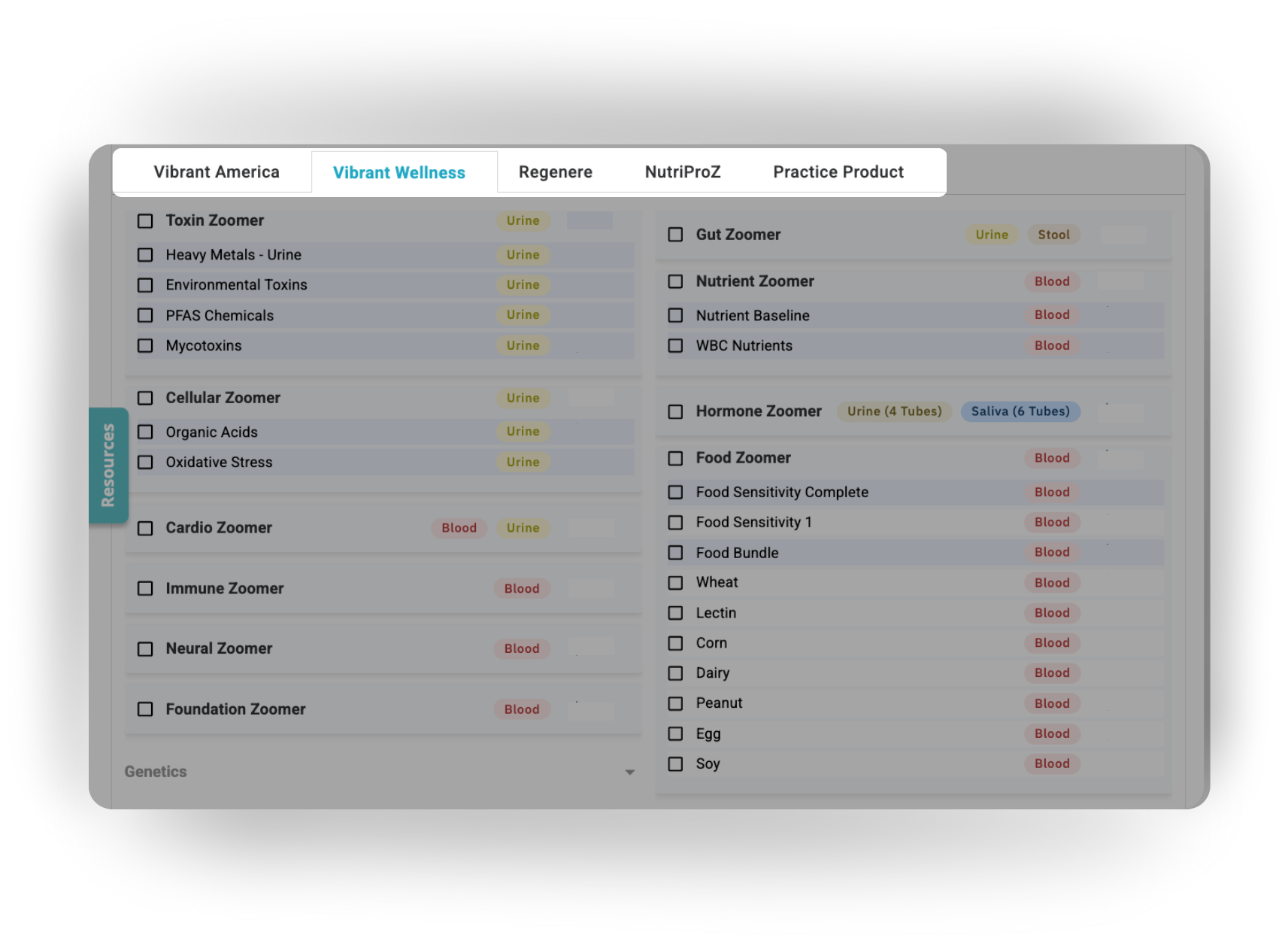 - Tests are grouped under defined categories, including Vibrant America, Vibrant Wellness, Regenere, NutriProz, and Practice Products.